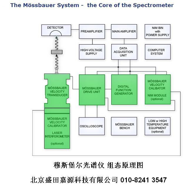 本谱仪是根据无反冲原子核共振吸收γ射线的原理制成的一套仪器,它是一种匀加速的穆斯堡尔谱仪,测量共振吸收谱。主要用于分析含铁物质的超精细结构,是许多科研领域和教学实验必备的设备。还可以研究在外加磁场下磁性材料的微观磁性和宏观磁性的内在联系,增加研究自旋结构和自旋动力学研究功能,可用来研究磁性材料、高温超导等固体材料中原子核与其周围环境的电或磁的相互作用。进一步研究周围原子的微观磁性、电子结构、价态和分布,以及晶格动力学、晶格弛豫等方面的性质。穆斯堡尔谱仪具有极高的能量分辨率的优点,是研究物质超精细相互作用和微结构性质的有力手段之一。其组态方框图见上图。原理图如下。
